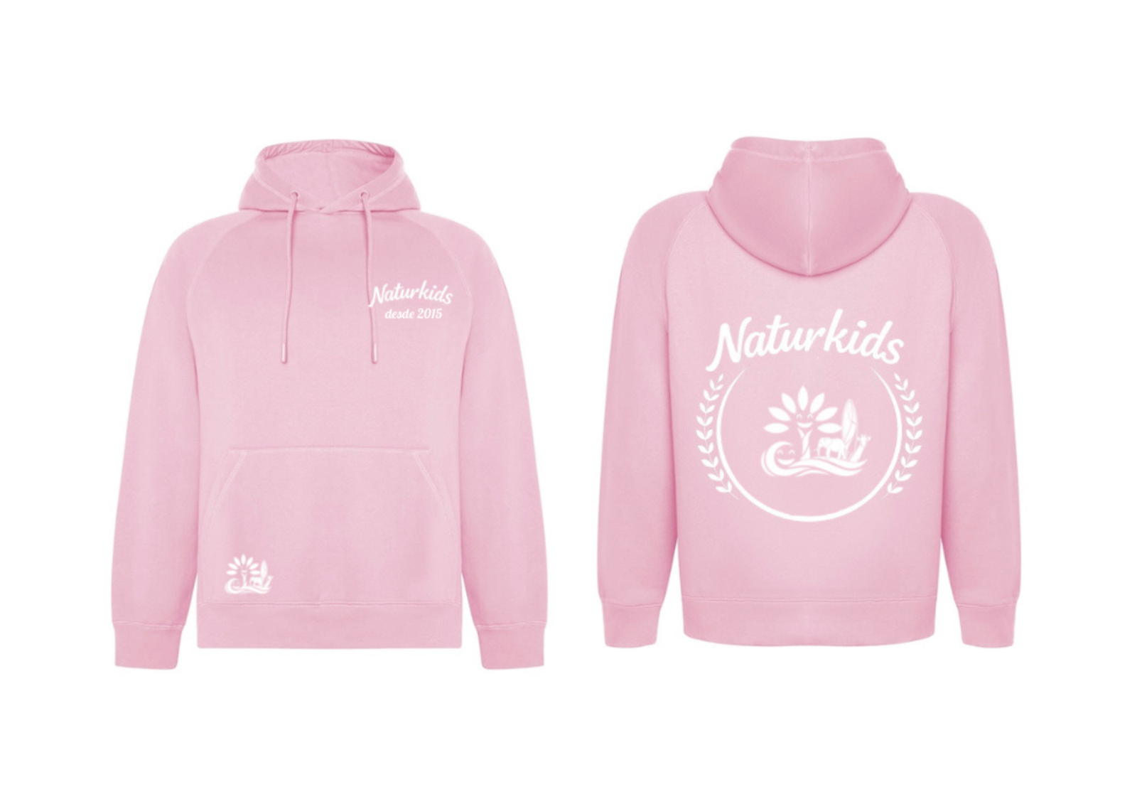 Sudadera canguro con capucha y bolsillo delantero, confeccionada en un suave rosa clarito, con el logo Naturkids grabado en blanco.